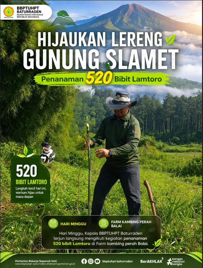Baturraden - Kepala BBPTUHPT Baturraden melaksanakan kegiatan penanaman sebanyak 520 bibit lamtoro sebagai bagian dari upaya pengembangan pakan hijauan dan peningkatan keberlanjutan sektor peternakan. Kegiatan ini menjadi langkah strategis dalam mendukung ketersediaan pakan berkualitas bagi ternak sekaligus menjaga kelestarian lingkungan.